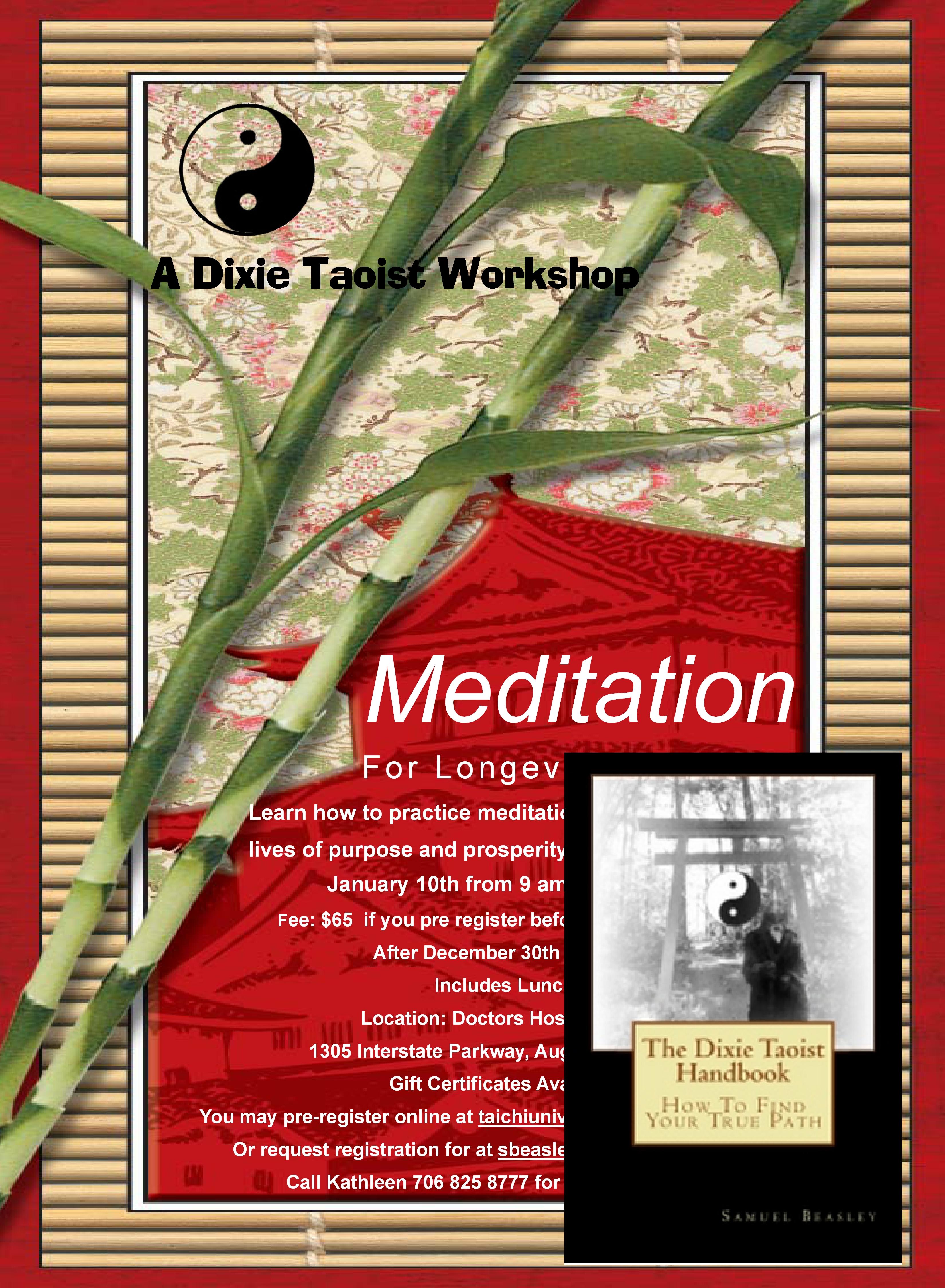 The first is on January 10th, 2015. This workshop is titled “A Meditation Workshop”. It could also be called Beginners meditation for Tao Cultivators. This 6 hour workshop will cover the first Section of the upcoming book including chapters 1 through 5. This is a step by step process for finding your true path as described in the book, The Dixie Taoist Handbook which is in editing and due early next year.