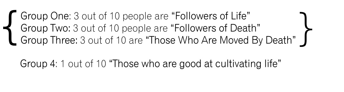 “The Followers of Life” describes the first group that makes up 3 out of ten people. Here followers of life are those who live with the extreme of fear and worry. Moderation is arguably the best way to cultivate life. When a person becomes extreme in their views, they are no longer following the Tao. It is said that “Followers of life” are people whose choices are directed by seeking security and avoiding risk as a way of life. Extreme fears are personal but not necessarily unique. Fears limit us because it deteriorates the willingness to try. “Followers of life” always play it safe. The life of always playing it safe is one that can lack innovation. It is difficult to find inspiration when you are always running away from the things that you fear. This kind of life can become dull and stagnant. The followers of life are weakened by dullness and lack of challenge. Always playing it safe to the extreme is not the way of a full and successful life.